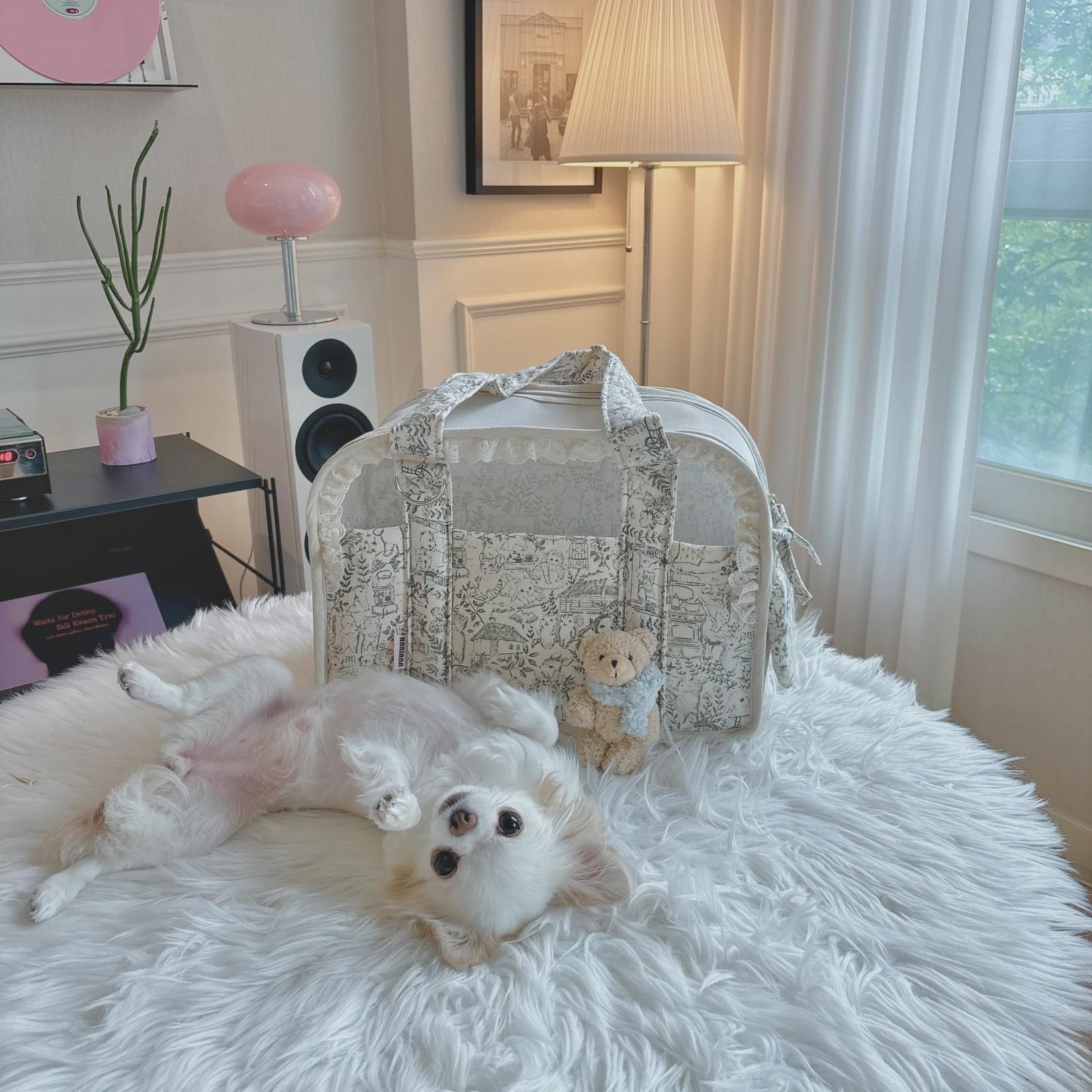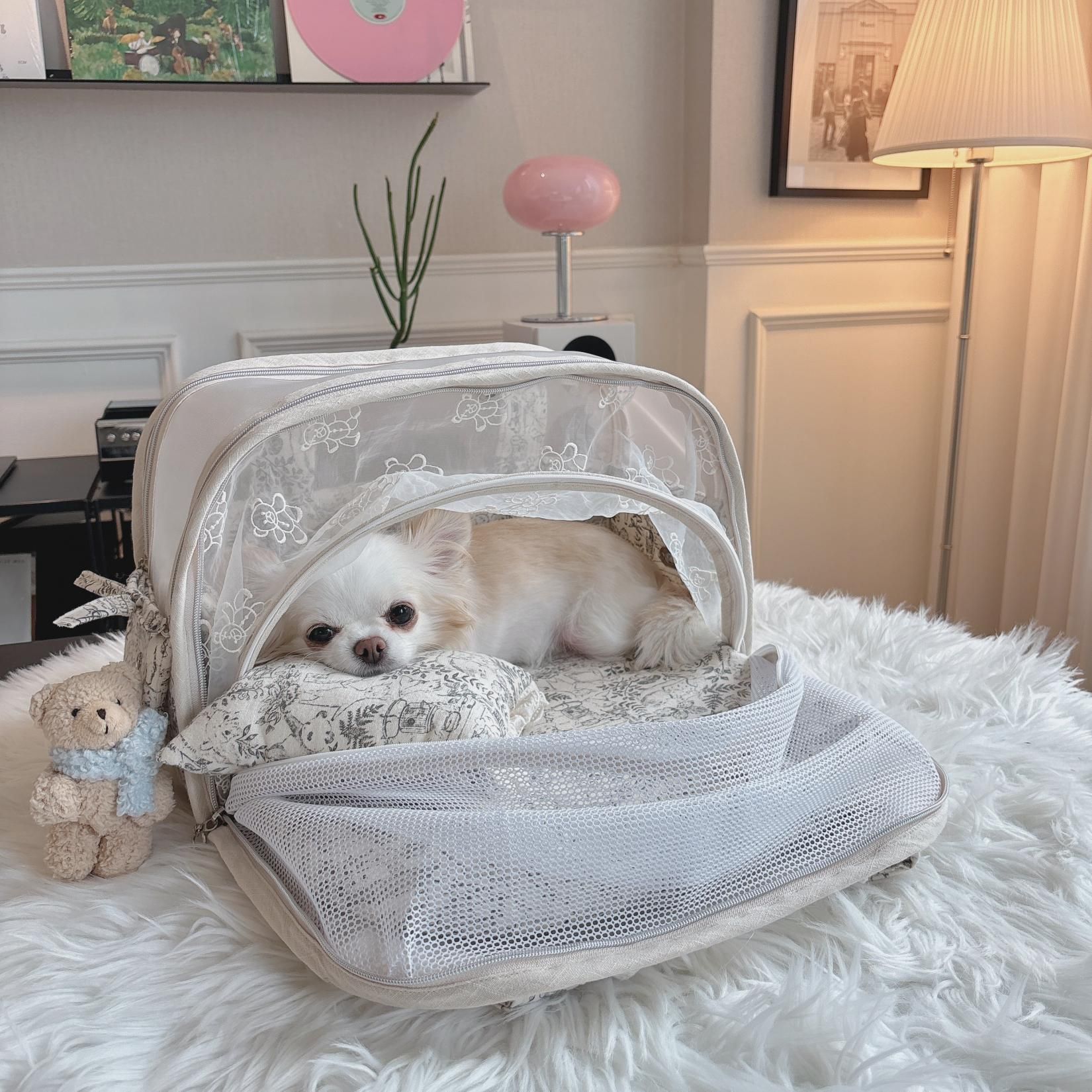 フルシースルーメッシュで製作され、飛行機、公共交通機関を利用時や長時間のご移動時、開放感があるように製作しました。どんな季節にも合い、シンプルで高級感のあるキューブ型デザインにラウンドディテール。可愛くてふわふわな雰囲気を加えました。